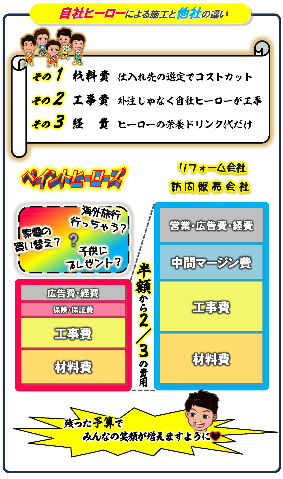 このような事態に陥ると、もう外壁塗装工事や屋根塗装工事では解決できません。屋根の葺き替え工事や、サイディングの張り替え工事などで対応することになり、外壁塗装工事や屋根塗装工事よりも費用がかさみます。つまり、長期的な視点で見ると、定期的に外壁塗装工事や屋根塗装工事をする方が、かかる費用が少なくすむといえます。