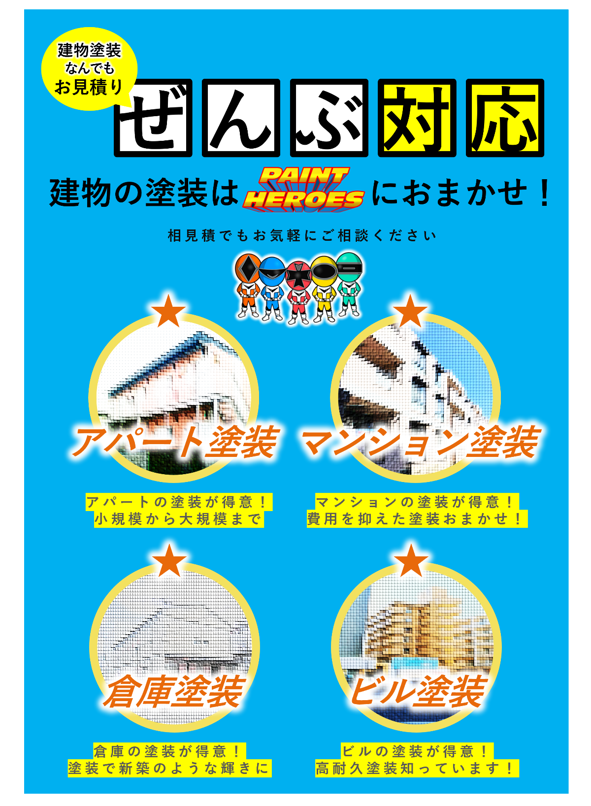 ぺイントヒーローズは戸建て住宅以外にも、アパートやマンション、ビルや倉庫など、建物全般の塗装を承っております。低コストで納得安心の塗装工事は、是非、ペイントヒーローズにお任せ下さい!
