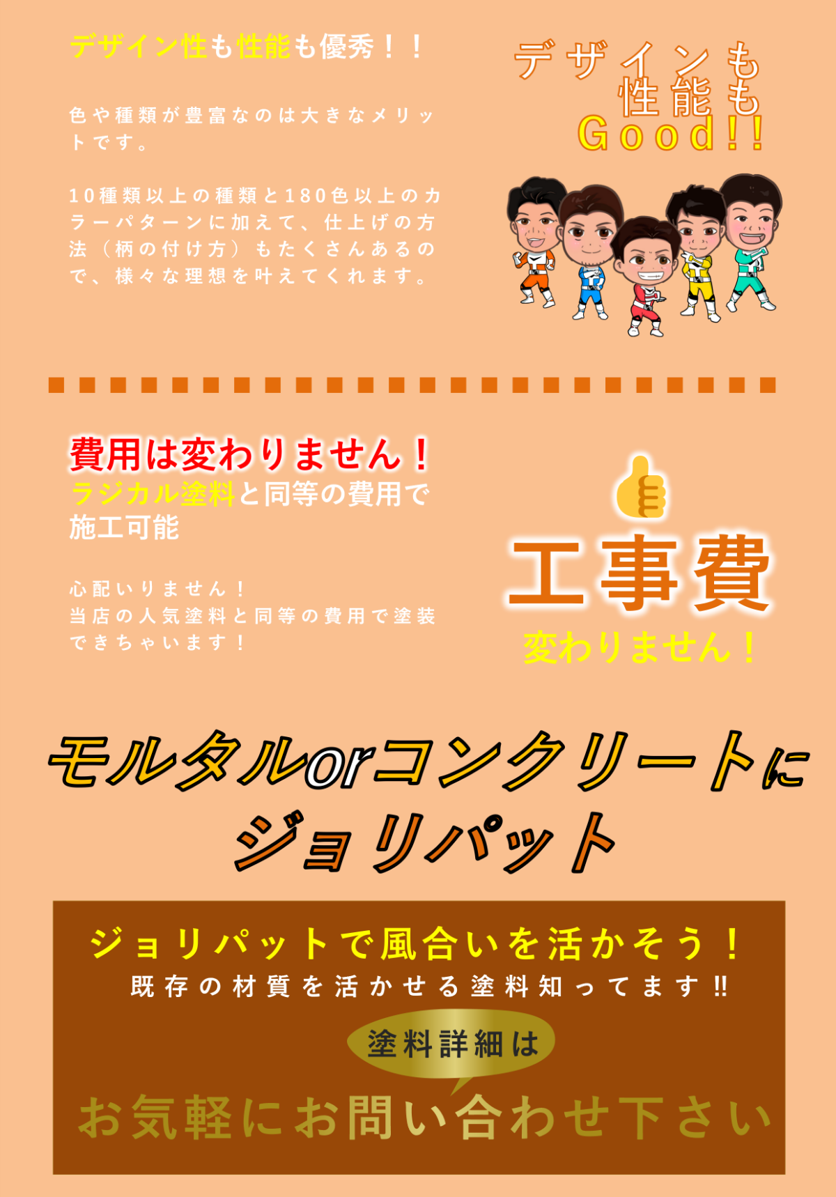 一般的なサイディングの費用は3000~5000円/m2程度であるのに対して、ジョリパットは標準グレードの費用は5000円前後/m2(300m2の場合)。内装向けの不燃タイプや、材料のグレードが高いもの、施工の手間がかかるものはより高くなる。他の仕上げ材に比べると費用は割高に。