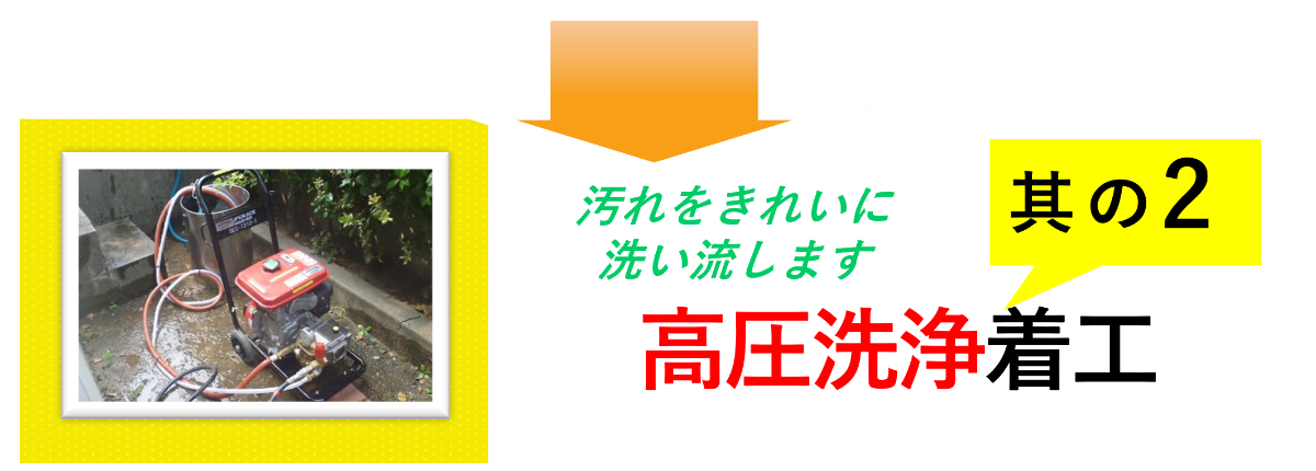 塗装作業のための足場設置が完了したら、高圧洗浄機を使用して、高圧洗浄を行います。高圧洗浄をするのは、既存壁の塗膜に付着した、汚れ、垢、苔などを取り除くためです。