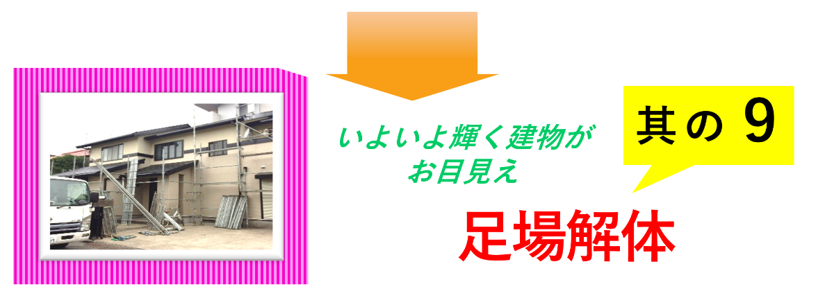 完了検査にて問題なく塗装作業が完了したことをご確認いただき、足場の解体となります。塗装工事中の廃材や道具の片づけ、清掃、足場の解体で、外壁塗装工事、屋根塗装工事作業が全て完了となります。