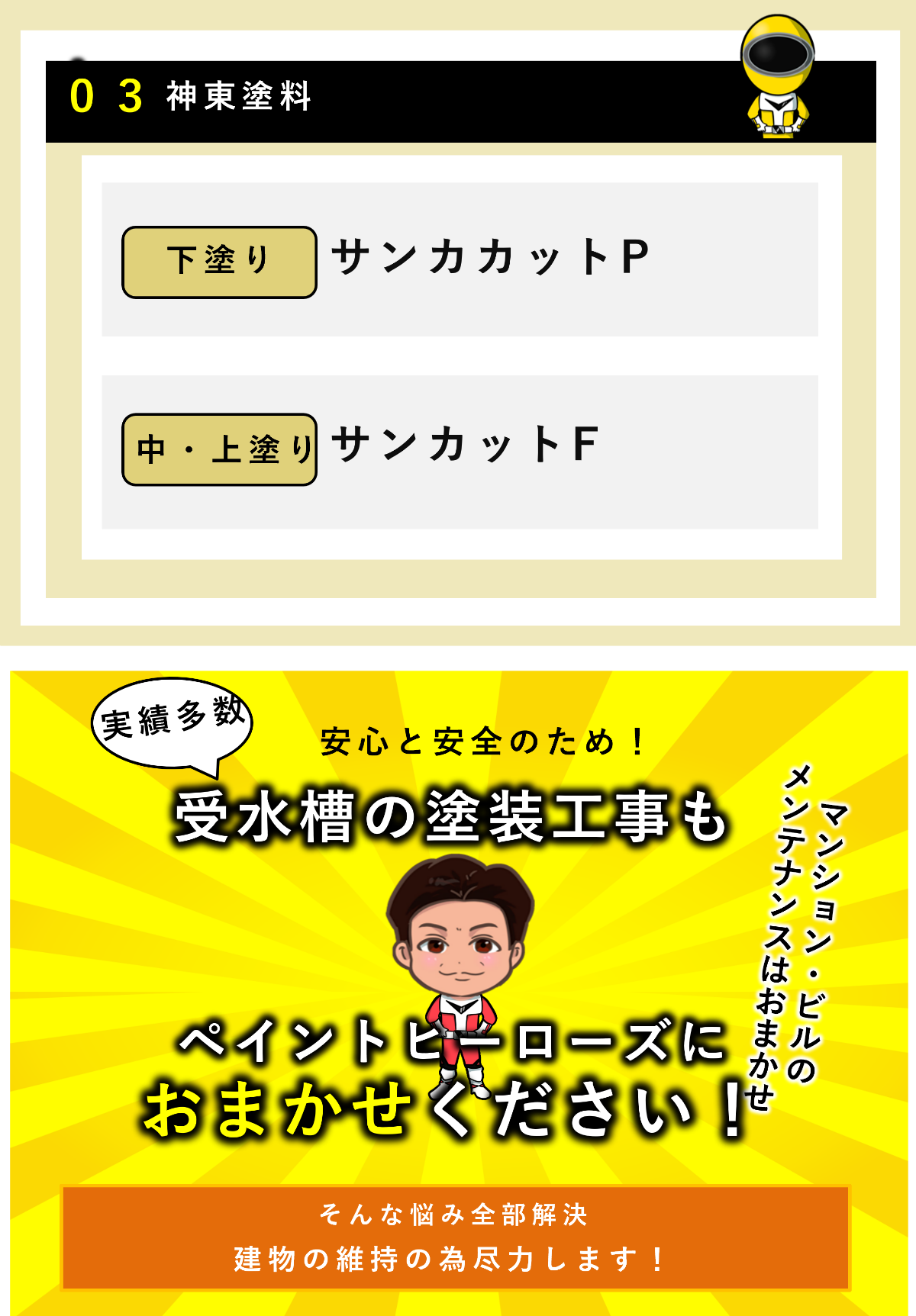 各メーカーとも上塗り塗料は弱溶剤型二液性アクリルシリコン樹脂塗料タイプの例です。